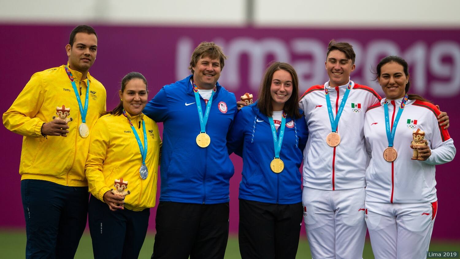 (L-R) Colombia, Team USA and Mexico in the mixed recurve team medal ceremony at the Pan American Games Lima 2019 on Aug. 11, 2019 in Lima, Peru.