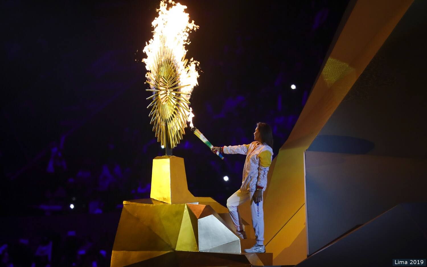 Cecilia Tait lights the torch to signify the start of the Pan American Games Lima 2019 on July 26, 2019 in Lima, Peru