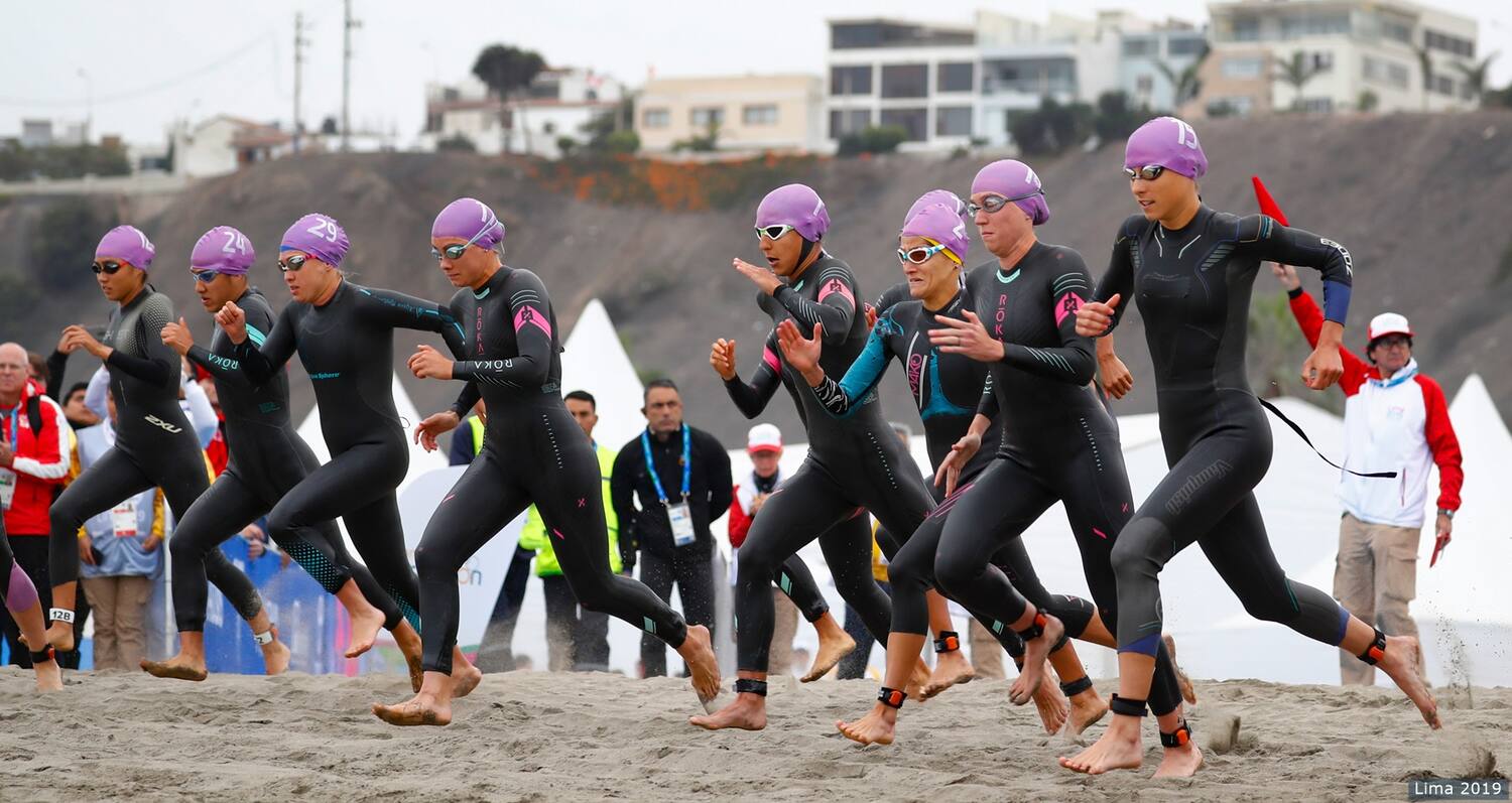Women during the triathlon competition at Playa Chorrillos at the Pan American Games Lima 2019 on July 27, 2019 in Lima, Peru.