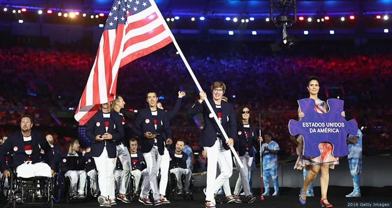 Flag bearer Allison Jones leads the U.S. team into the stadium during the Opening Ceremony of the Paralympic Games Rio 2016 on Sept. 7, 2016 in Rio de Janeiro.
