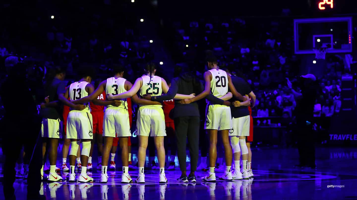 The UConn Huskies and the U.S. women's national team huddle together before the USA Women's National Team Winter Tour 2020 game on Jan. 27, 2020 in Hartford, Conn.