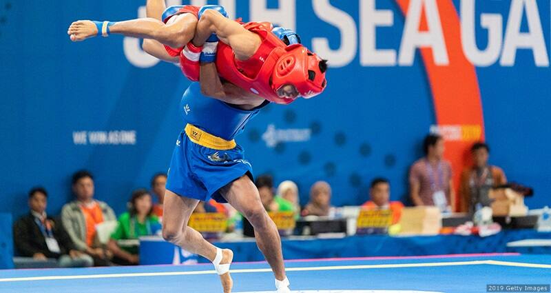 Mandal Arnel (R) of the Philippines wins the final against Pratama Laksamana Pandu (L) of Indonesia in the men's 52 kg. wushu Sanda at the Southeast Asian Games on Dec. 3, 2019 in Manila, Philippines.