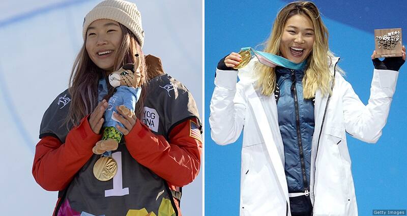 Chloe Kim is pictured celebrating her gold medals at the Winter Youth Olympic Games Lillehammer 2016 (L) and Olympic Winter Games PyeongChang 2018 (R).