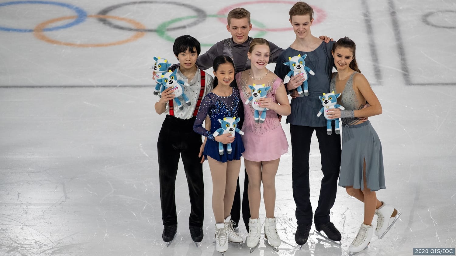 (L-R) Yuma Kagiyama, Kate Wang, Jedidiah Isbell, Catherine Fleming, Alexander Shustitskiy and Sofya Tyutyunina poses for a photo at the Winter Youth Olympic Games Lausanne 2020 on Jan. 15, 2020 in Lausanne, Switzerland.