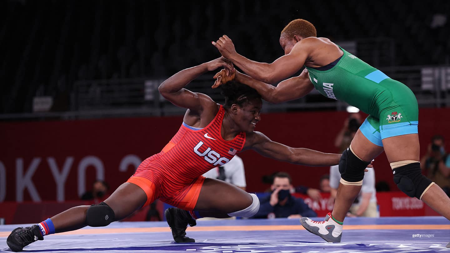 Mensah-Stock endeared herself to Olympic fans after she beat Nigeria’s Blessing Oborududun, 4-1, in women’s freestyle wrestling’s 68-kg finals at the Tokyo Games. She made a heart sign with her hands, then cried “tears of joy.”