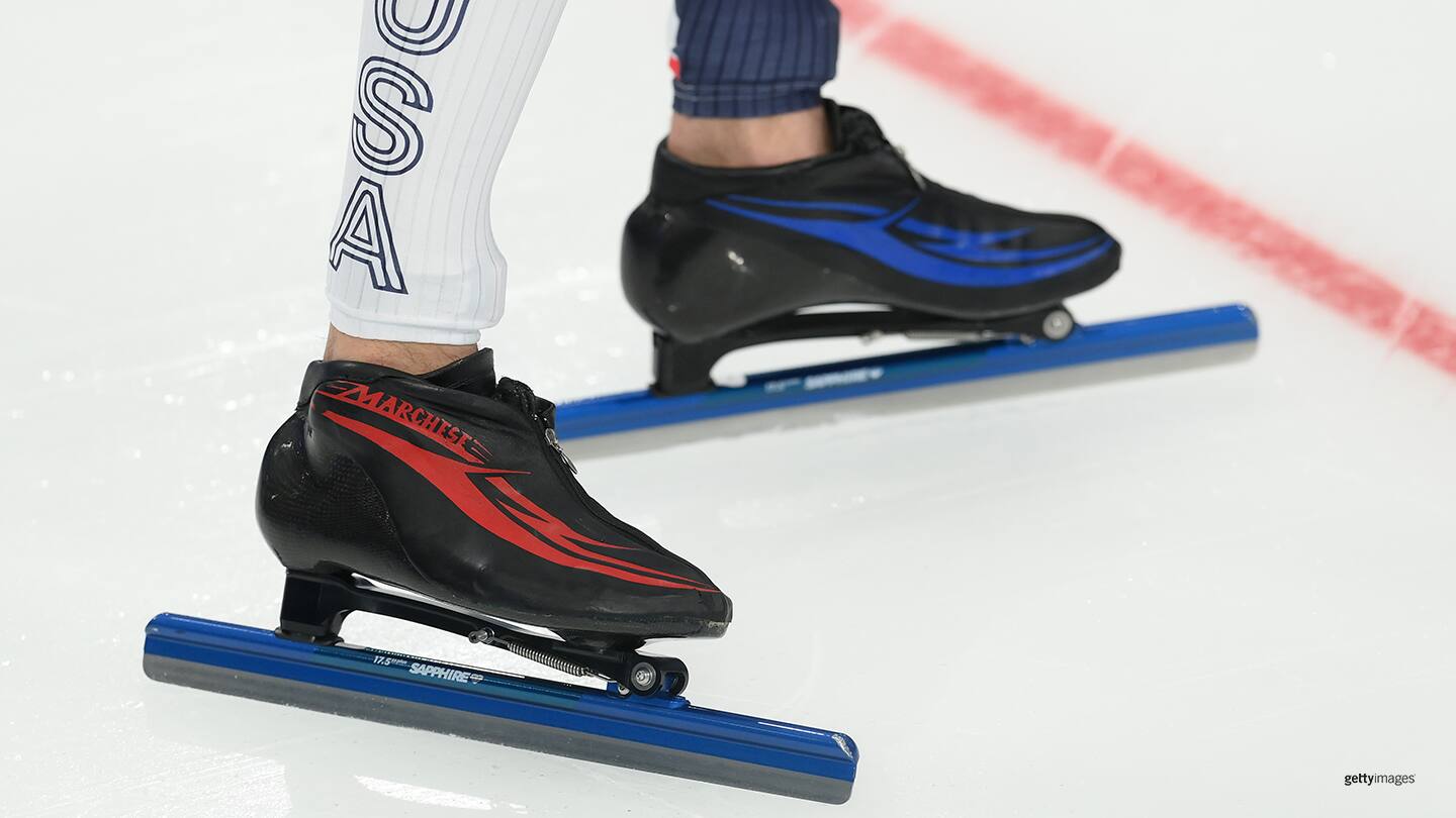 Detailed view of Casey Dawson's skates prior to the men's 1500-meter race during the Winter Olympic Games Beijing 2022 on Feb. 8, 2022 in Beijing.