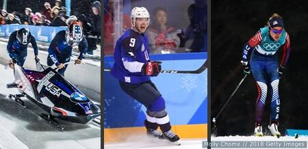 Photo credit: Molly Choma/ USABS (bobsled) / 2018 Getty Images (hockey and skiing)