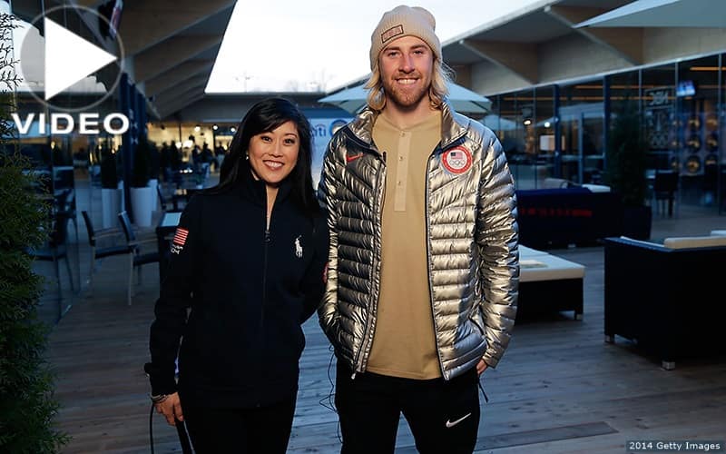 Sage Kotsenburg speaks to Kristi Yamaguchi after winning the first gold medal of the Sochi Games
