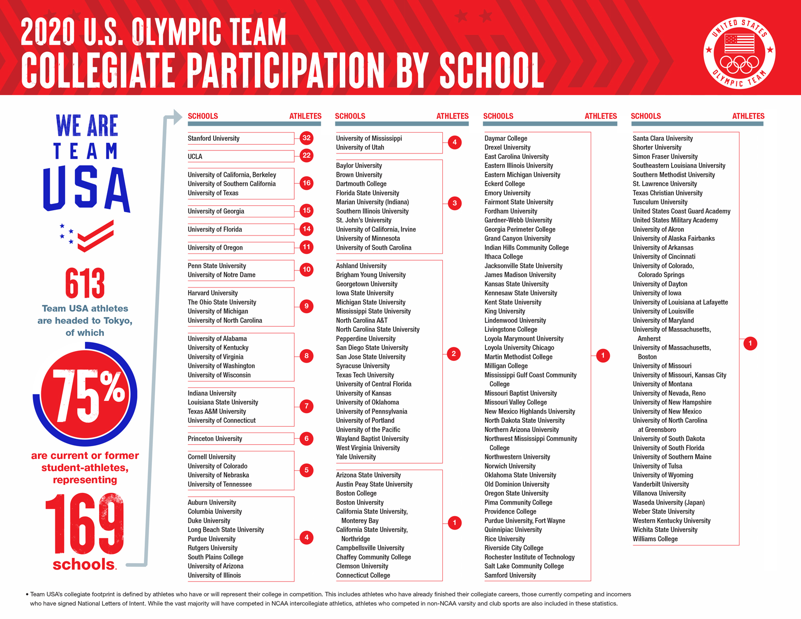 The 2020 U.S. Olympic Team was comprised of 635 athletes who competed for Team USA across 44 sports in Japan. Of those 635 athletes, more than 75% competed collegiately across 171 schools. College athlete representation on the 2020 U.S. Olympic Team spanned all three NCAA Divisions (I, II and III), as well as junior colleges and collegiate club programs. In addition: