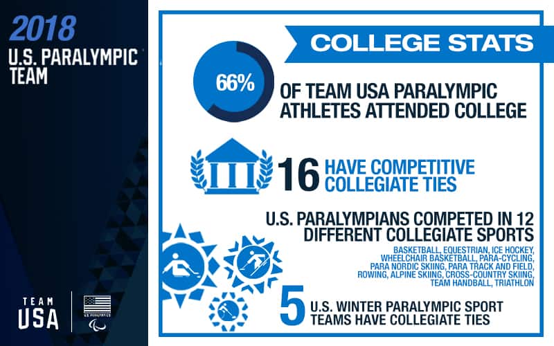 In total, 16 U.S. Paralympians competed collegiately at 14 different schools. Of the five Paralympic sports being contested in PyeongChang, Team USA has at least one collegiate tie in each sport.