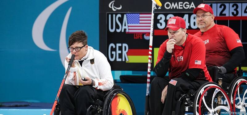 Kirk Black (C) and Steve Emt compete against Germany at the Paralympic Winter Games PyeongChang 2018 on March 11, 2018 in Gangneung, South Korea.