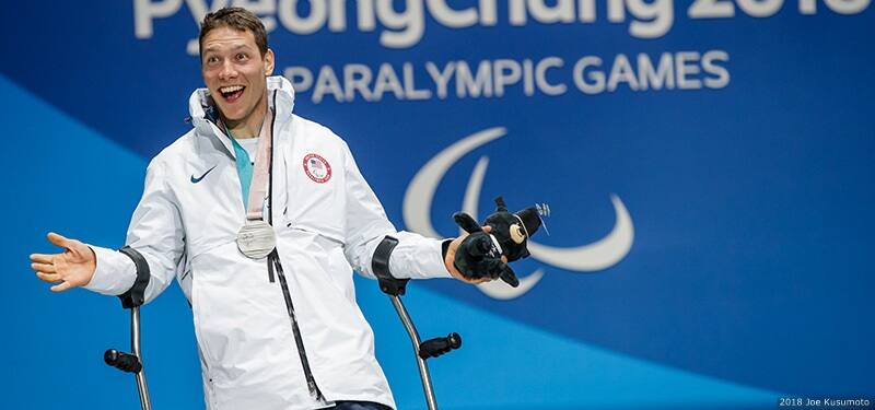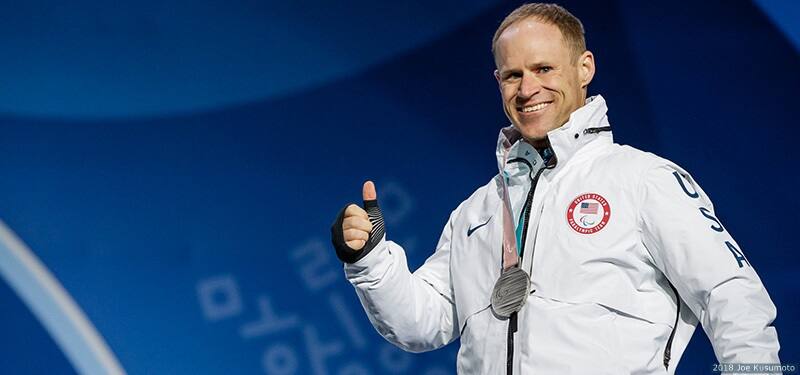 Dan Cnossen celebrates at the medal ceremony for the men's cross-country sitting 15-kilometer at the Paralympic Winter Games PyeongChang 2018 on March 11, 2018 in PyeongChang, South Korea.