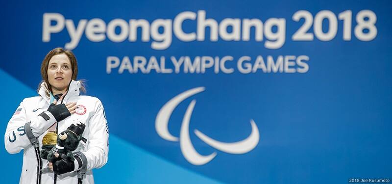 Kendall Gretsch celebrates at the medal ceremony for the women's 12-kilometer sitting cross-country at the Paralympic Winter Games PyeongChang 2018 on March 11, 2018 in PyeongChang, South Korea.