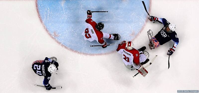 Brody Roybal (#4) scores a goal against Japan at the Paralympic Winter Games PyeongChang 2018 on March 11, 2018 in Gangneung, South Korea.