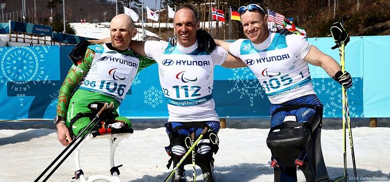 (L-R) Dzmitry Loban of Belarus, Andy Soule and Dan Cnossen celebrate during the victory ceremony for the men's sitting cross-country sprint at the Paralympic Winter Games PyeongChang 2018 on March 14, 2018 in PyeongChang, South Korea.
