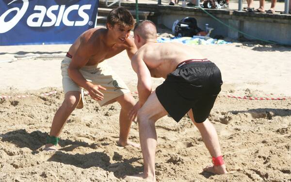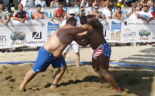 Ike Okoli of the USA won bronze in the heavyweight division at the Beach Worlds in Greece.