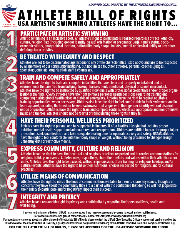 For more issues, information and resources regarding diversity, equity and inclusion please contact dei@usaartisticswim.org or aec@usaartisticswim.org.