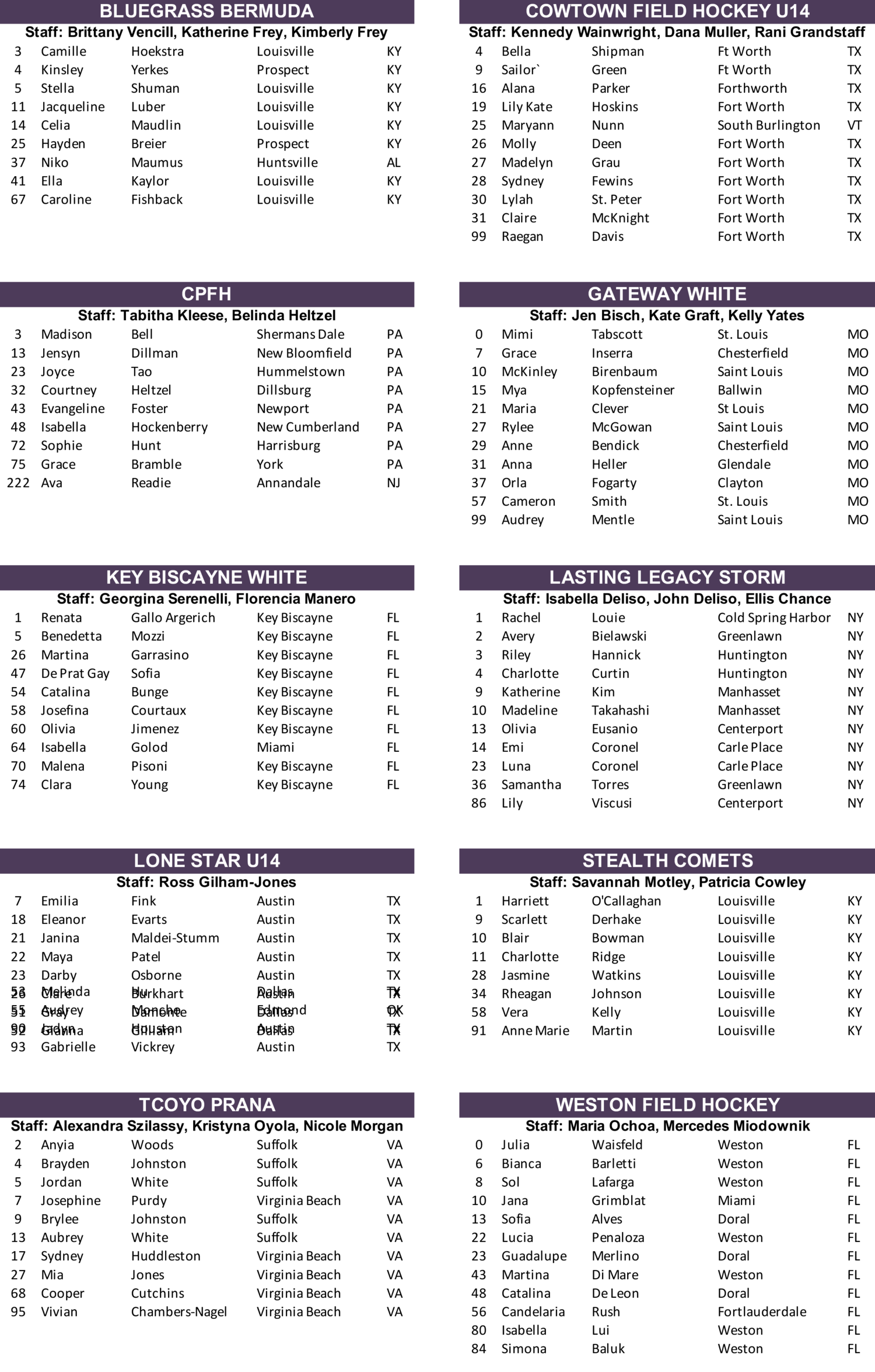 U-14 Girls 7v7 Rosters