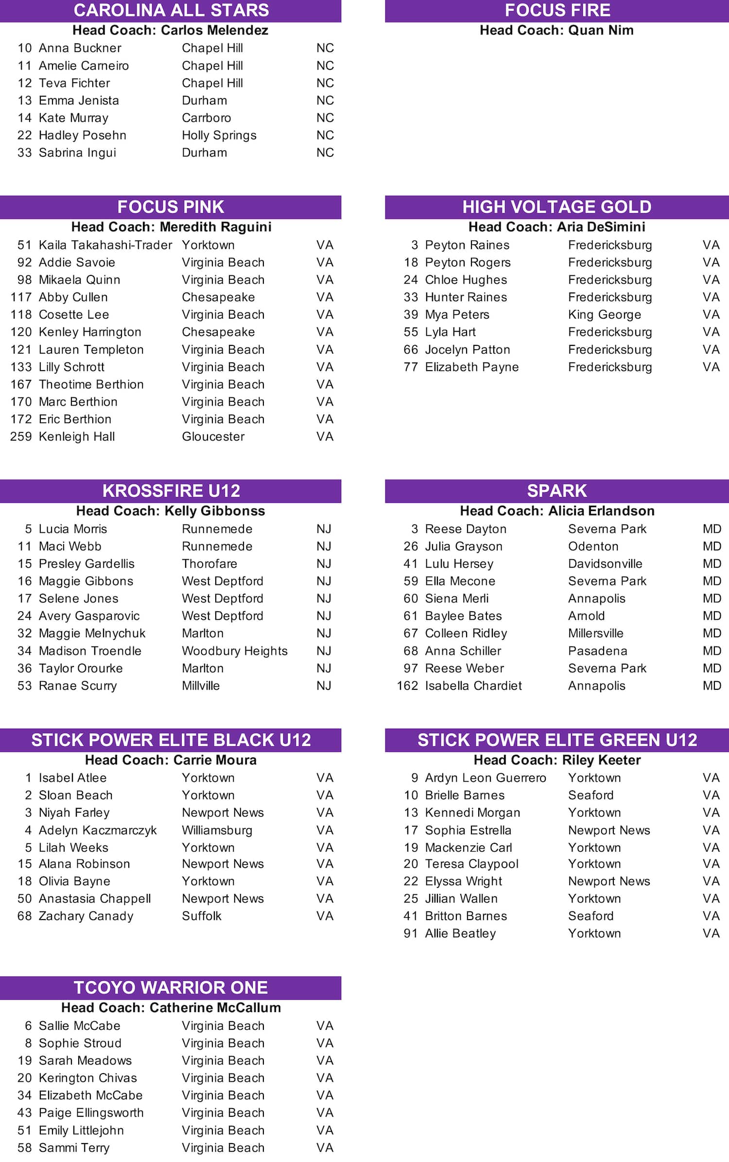 U-12 Co-Ed Rosters