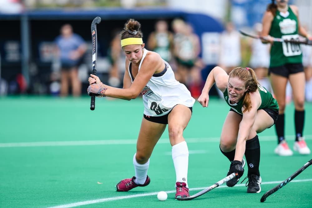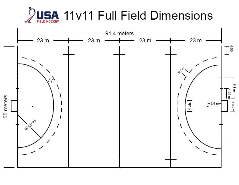 Field hockey, called just “hockey” outside of the United States and Canada, is traditionally played in an 11v11 game format. It is played by men and women in the Olympic Games on a 100-yard by 60-yard field. All high schools and colleges in the United States play 11v11 full-field.