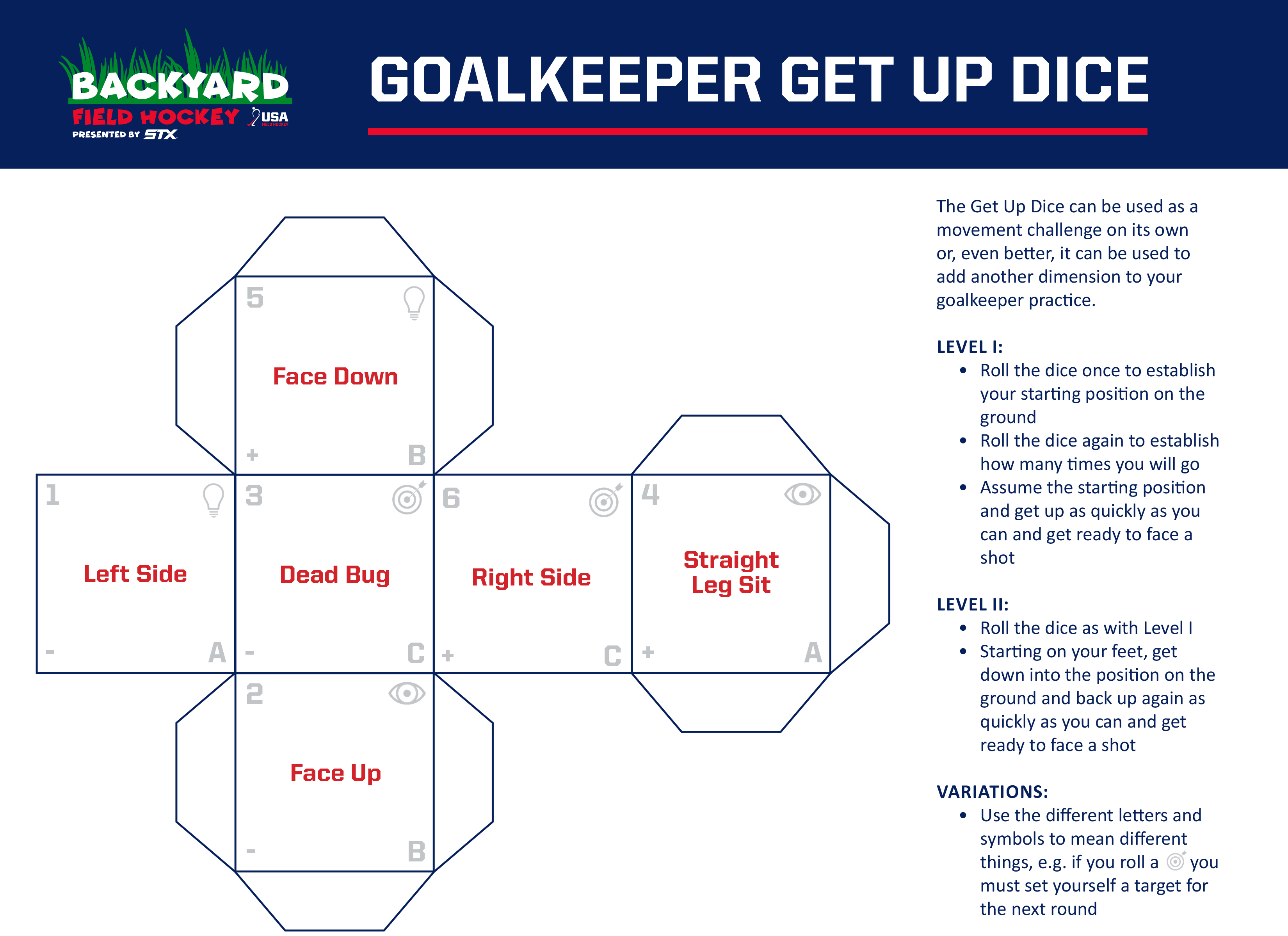 The Goalkeeping Get Up and Goal Scoring Dice invite players to add variety to their practice whether that be in the backyard or on the practice field. Roll the dice and go play!