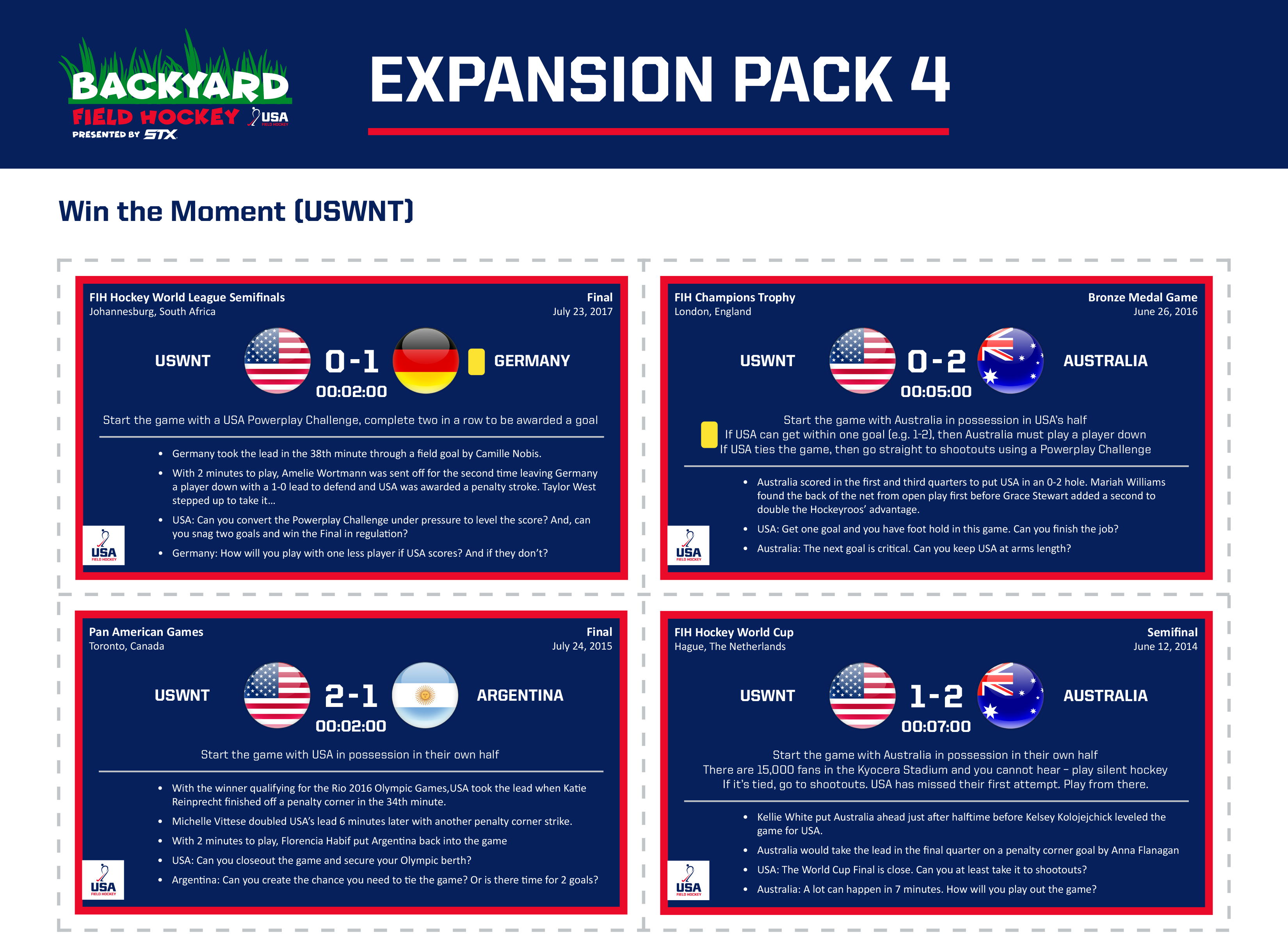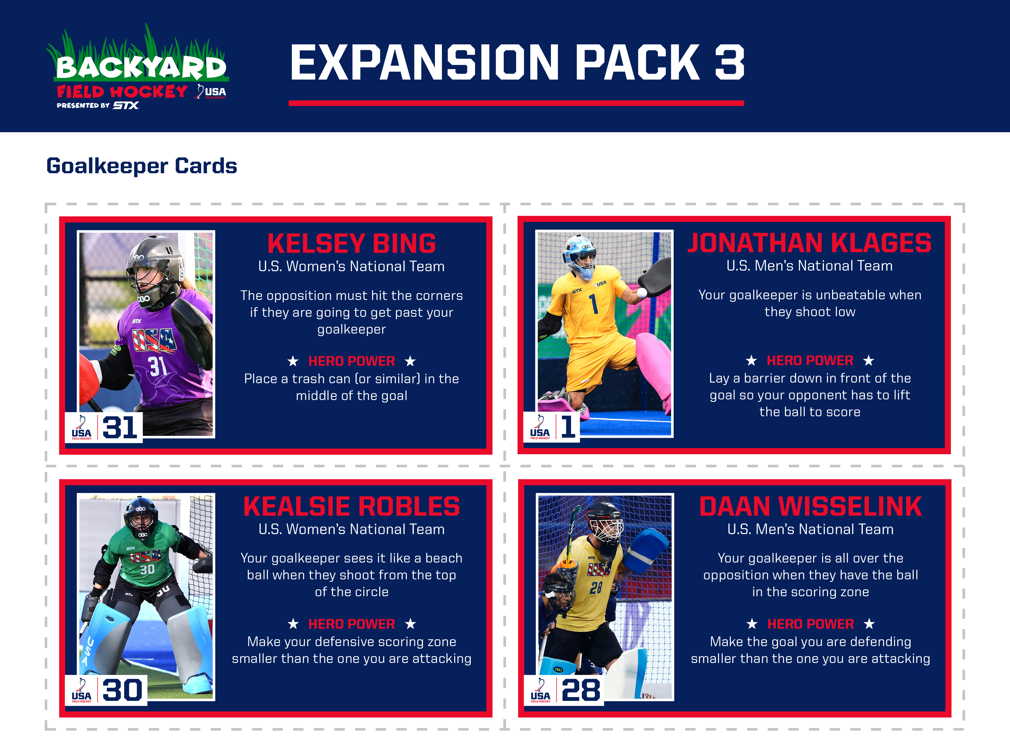 Over the coming month four expansion packs will add even more fun to your Backyard Field Hockey games starting with eight brand new Hero Power cards featuring four U.S. Men’s National Team and four U.S. Women’s National Team athletes that will be released next week.