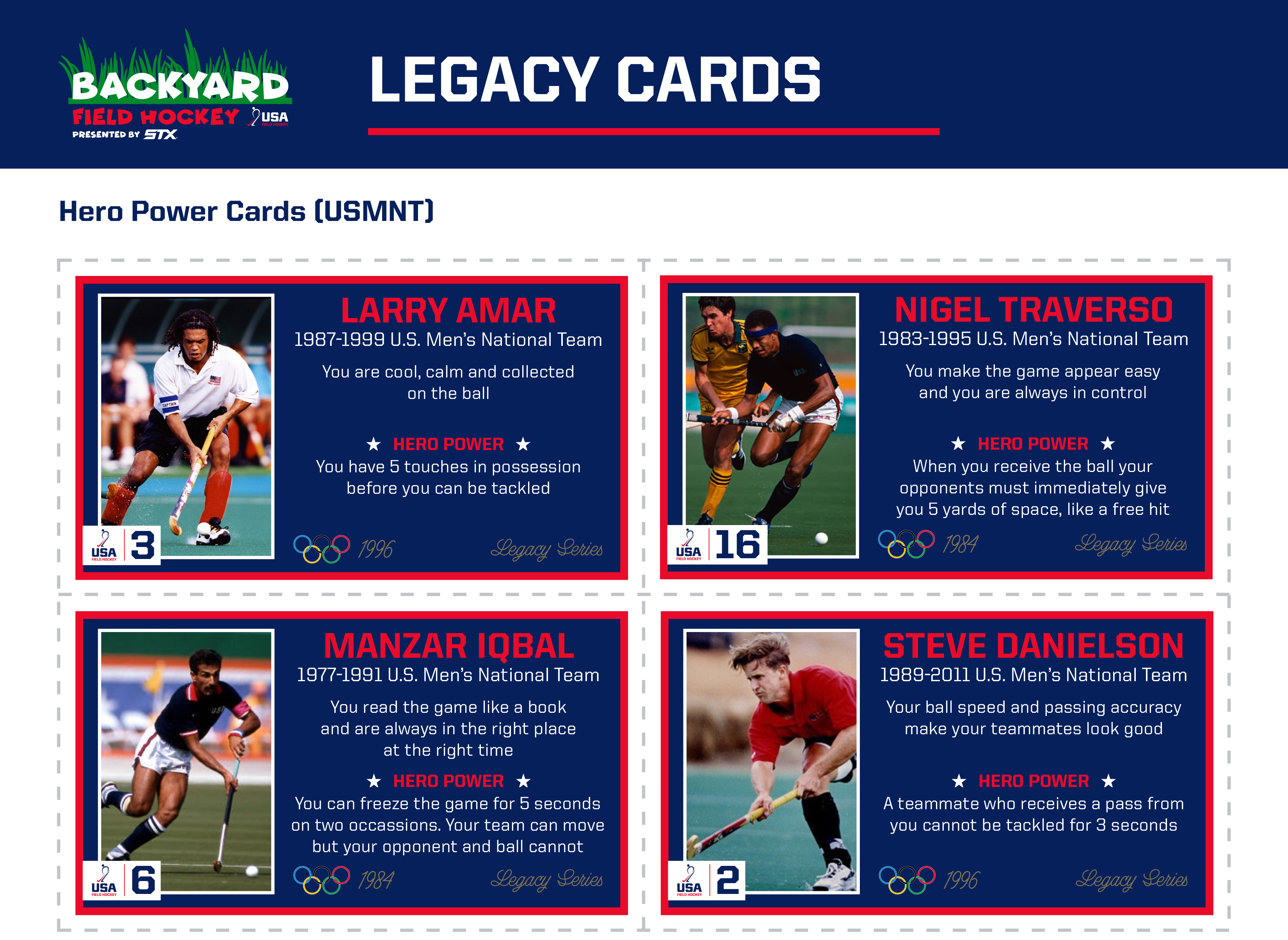 The Legacy Hero Power Cards feature U.S. Olympians who laid the foundation for the current generation. The men's Legacy Hero Power Cards feature Los Angeles 1984 Olympians Nigel Traverso and Manzar Iqbal along with Atlanta 1996 Olympians Steve Danielson, the most capped indoor and outdoor USMNT athlete, and Larry Amar. The women's feature Seoul 1988 and Atlanta 1996 Olympian Tracey Fuchs; Beijing 2008 Olympian Kate ‘Tiki’ Barber; and triple Olympians Katelyn ‘Falgo’ Ginolfi and Lauren Crandall, who both represented Team USA in the Beijing 2008, London 2012 and Rio 2016 Olympic Games.