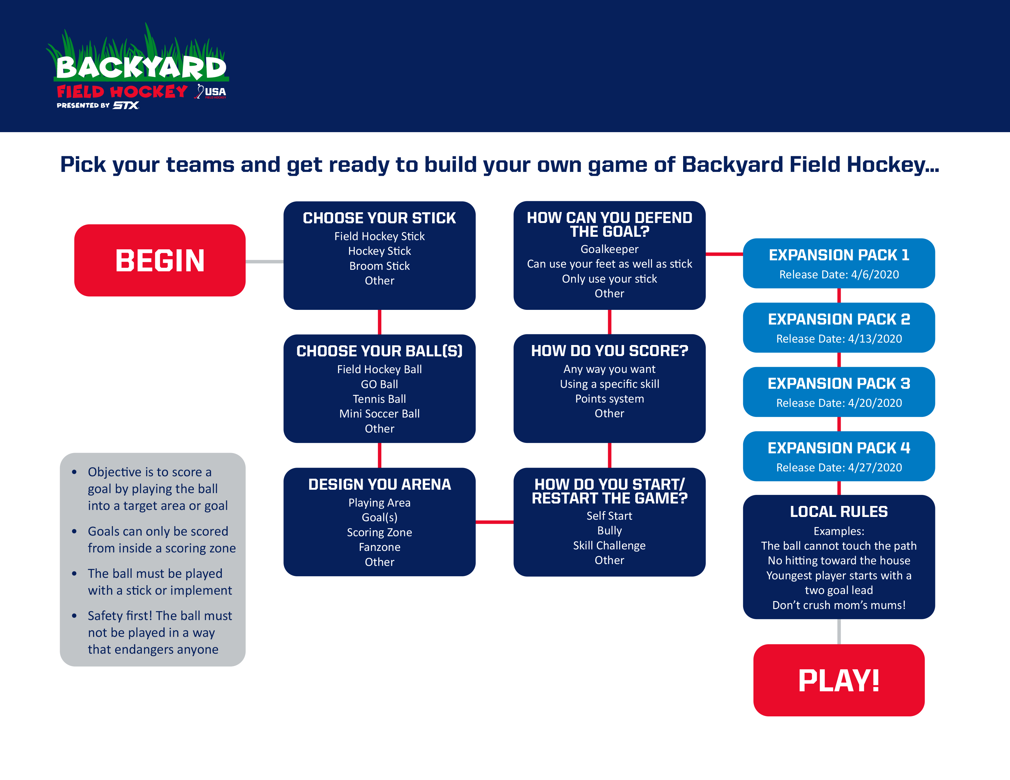Backyard Field Hockey can be played with two or more players and asks you, the players, to collaborate in designing your own game that’s challenging and fun for everyone. So, while you stay at home, grab your sisters, brothers, mom or dad, create your game and play!