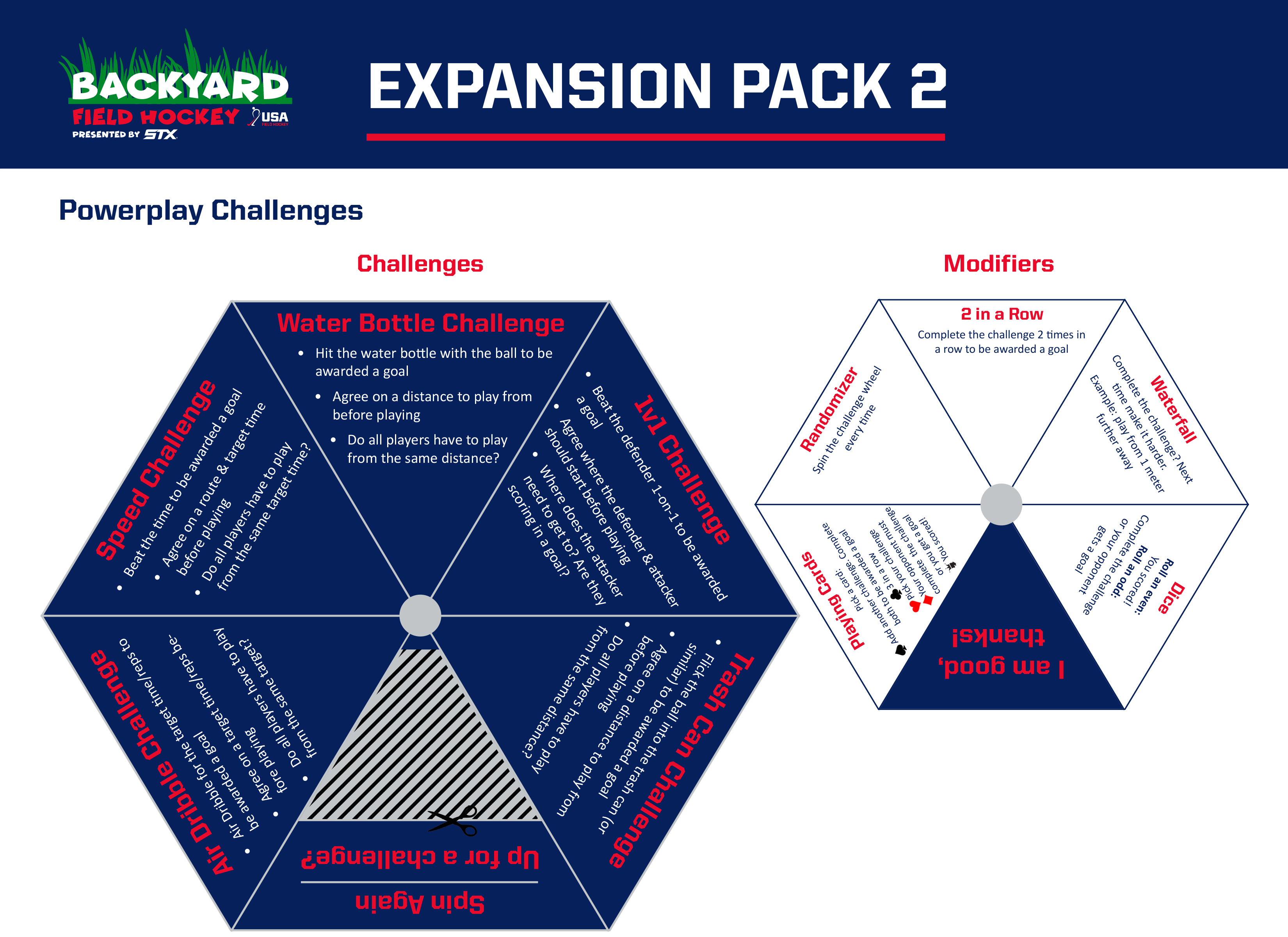 The Powerplay Challenge spinner allows players to add skill challenges to their Backyard Field Hockey games. Simply mount the printout on cardboard, cut out the spinner, place the smaller wheel underneath the bigger one so that it can be seen through the window and use a pen or pencil placed through the heart of the wheel to create the spinner. Just like the Hero Power Cards, the expansion pack includes a blank Powerplay Challenge spinner template so that players can create their own challenges.