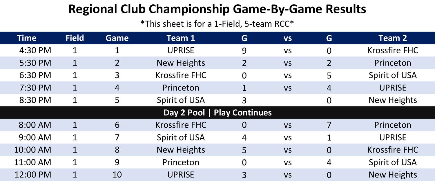 National Club Championship qualification: Regional Club Championships with 4 to 6 teams participating will qualify one Club; Regional Club Championships with 7 to 16 teams participating will qualify two Clubs, and regions with 17 or more teams participating will qualify 3 clubs. The remaining spots for the National Club Championship will be offered based on the current USA FH Club Ranking, to those Clubs placing 3rd in an RCC with 7 or more Clubs, or 2nd in an RCC with at least 4 Clubs. The highest ranked Club from amongst those, will be offered first until all spots have been filled.