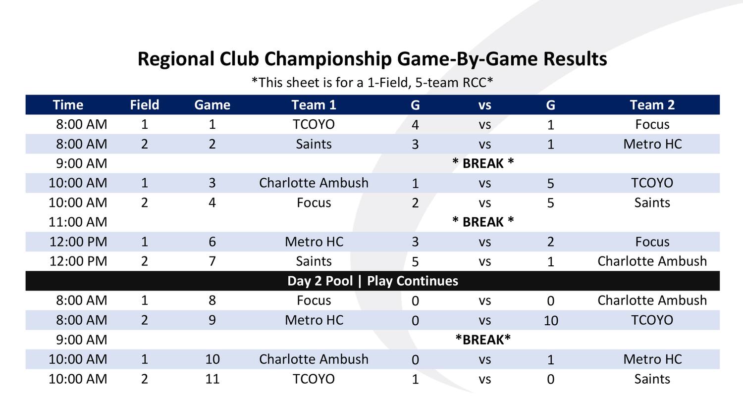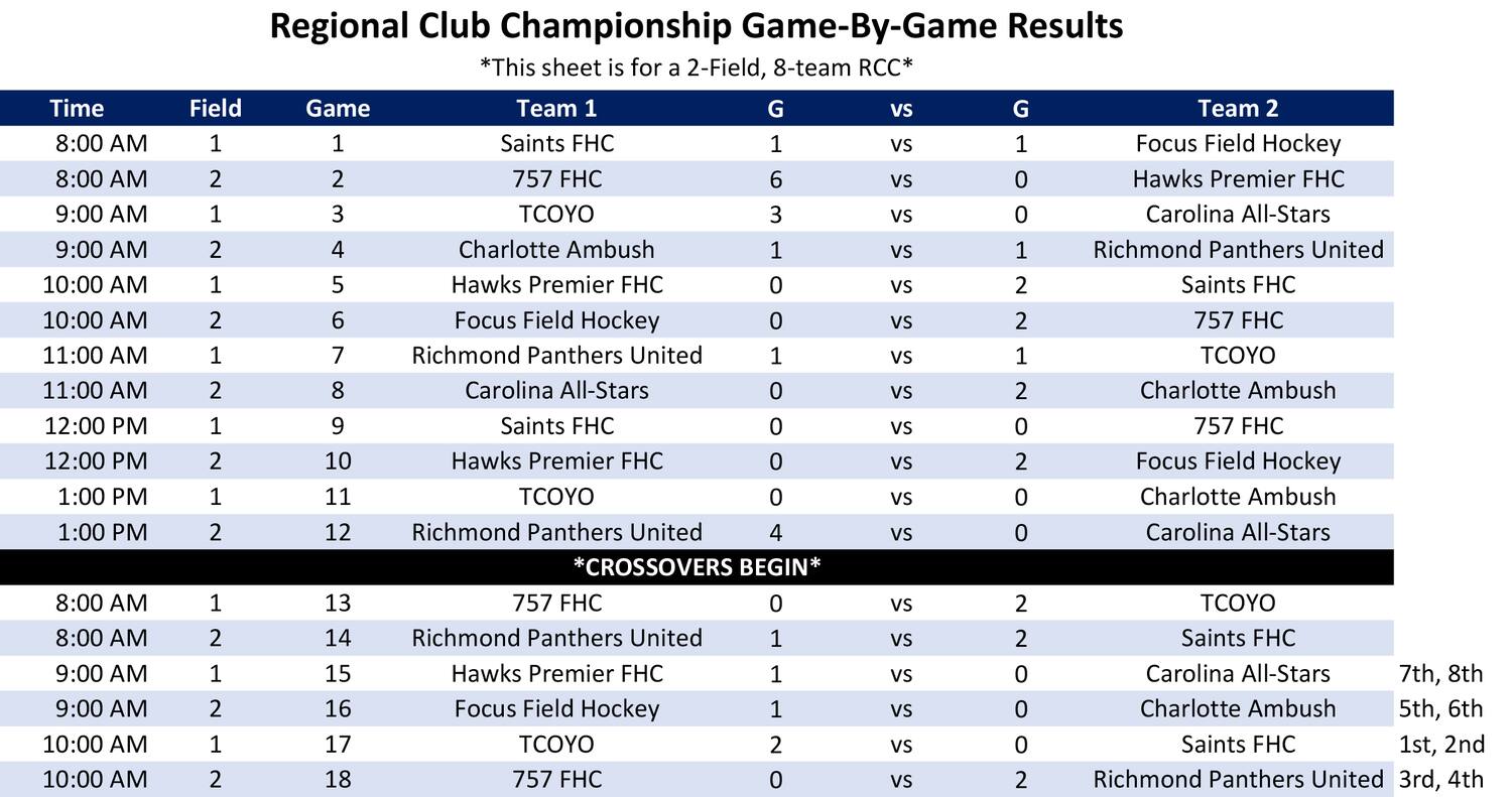 National Club Championship qualification: Regional Club Championships with 4 to 6 teams participating will qualify one Club; Regional Club Championships with 7 to 16 teams participating will qualify two Clubs, and regions with 17 or more teams participating will qualify 3 clubs. The remaining spots for the National Club Championship will be offered based on the current USA FH Club Ranking, to those Clubs placing 3rd in an RCC with 7 or more Clubs, or 2nd in an RCC with at least 4 Clubs. The highest ranked Club from amongst those, will be offered first until all spots have been filled.