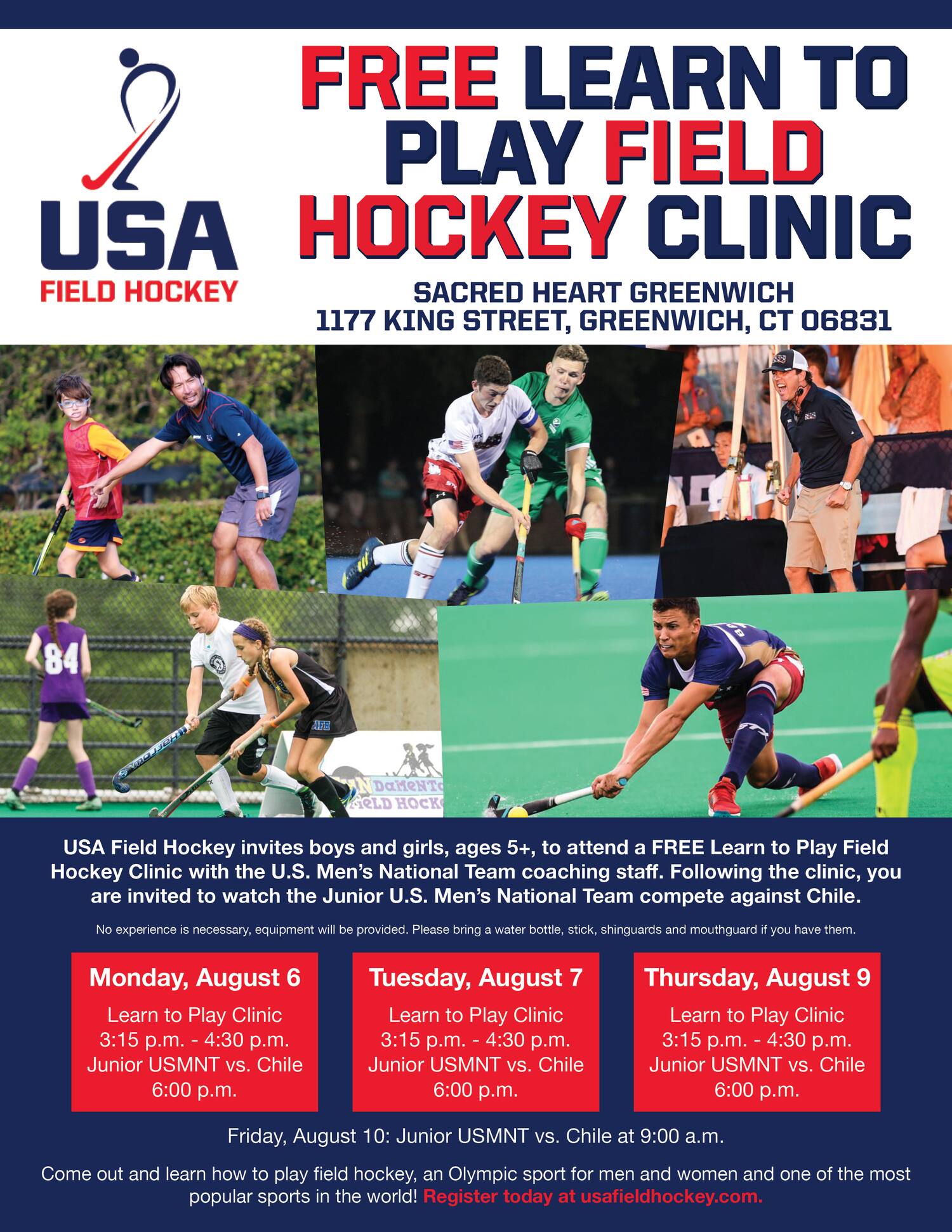 Free Learn to Play Field Hockey Clinic Greenwich, Connecticut Aug. 06 - 09, 2018 Share This Page To register, click on the corresponding date below: Monday, August 6 Tuesday, August 7 Thursday, August 9