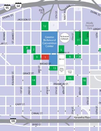Participants looking for downtown parking, should GPS or look up directions here for the GRRC Parking Deck at 351 North 3rd Street, Richmond, VA 23219. For rates parking rates, please click here. This lot has both general and handicapped parking spaces. The image by clicking 'Richmond Traffic/Parking' indicates the location of the GRRC Parking Deck in red. All other lots in green have additional parking space, for more information on these lots please click here and reference the corresponding lot/garage number.