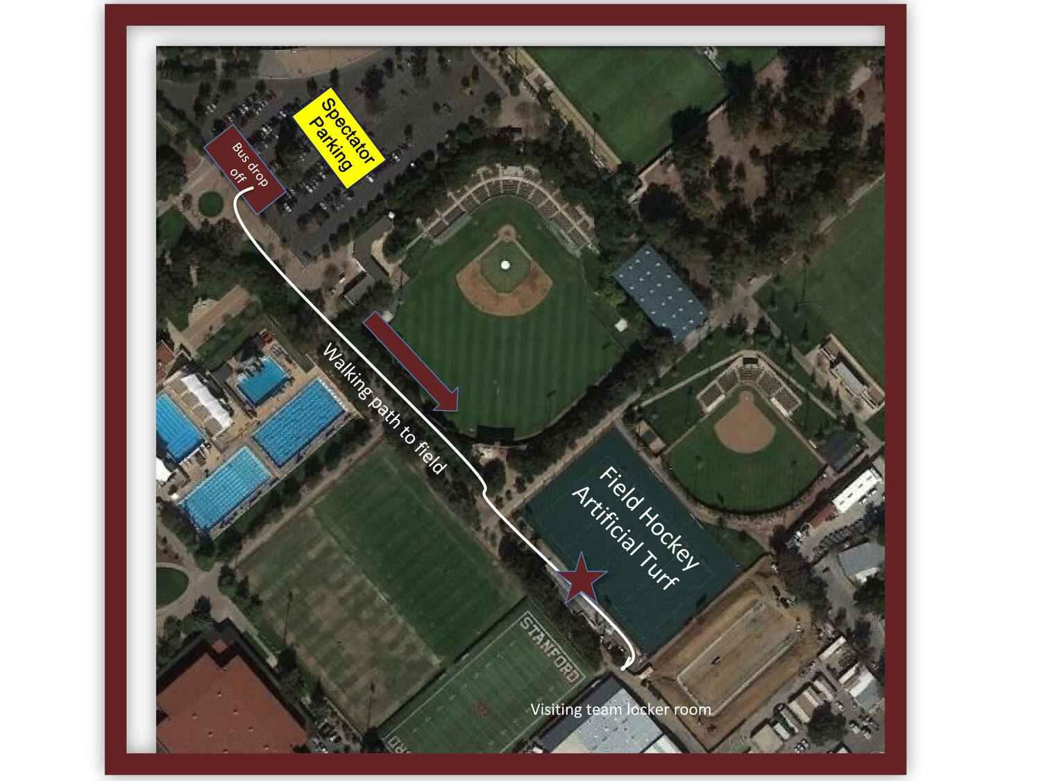 The Varsity Field Hockey Turf is located south of Klein Field at Sunken Diamond (the baseball stadium) and adjacent to Boyd & Jill Smith Family Stadium (the softball stadium). To access the field, walk from the west side of the Stanford Stadium parking lot (Varsity Lot) past Klein Field at Sunken Diamond. Parking is located in the Stanford Stadium parking lot (Varsity Lot) next to Klein Field at Sunken Diamond. Entrance to the lot is via Nelson Road, off of Galvez Street. Marked disabled spaces are available in the south end of the lot. A disabled placard (from any state) will be necessary to access the disabled parking areas. Searchable Campus Map