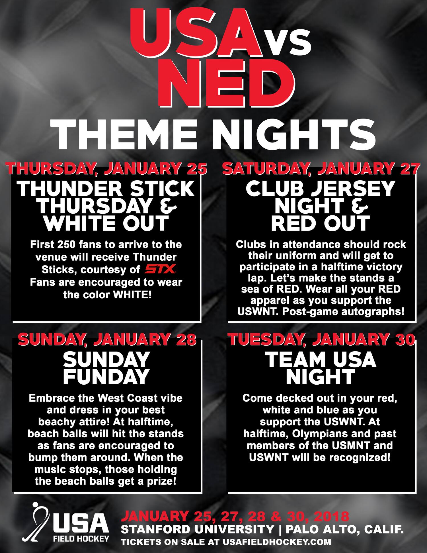 Discounted group tickets will also be available for each game when 10 or more tickets are purchased for the same match. Contact Glen Hollingsworth at ghollingsworth@usafieldhockey.com to purchase tickets for your group.