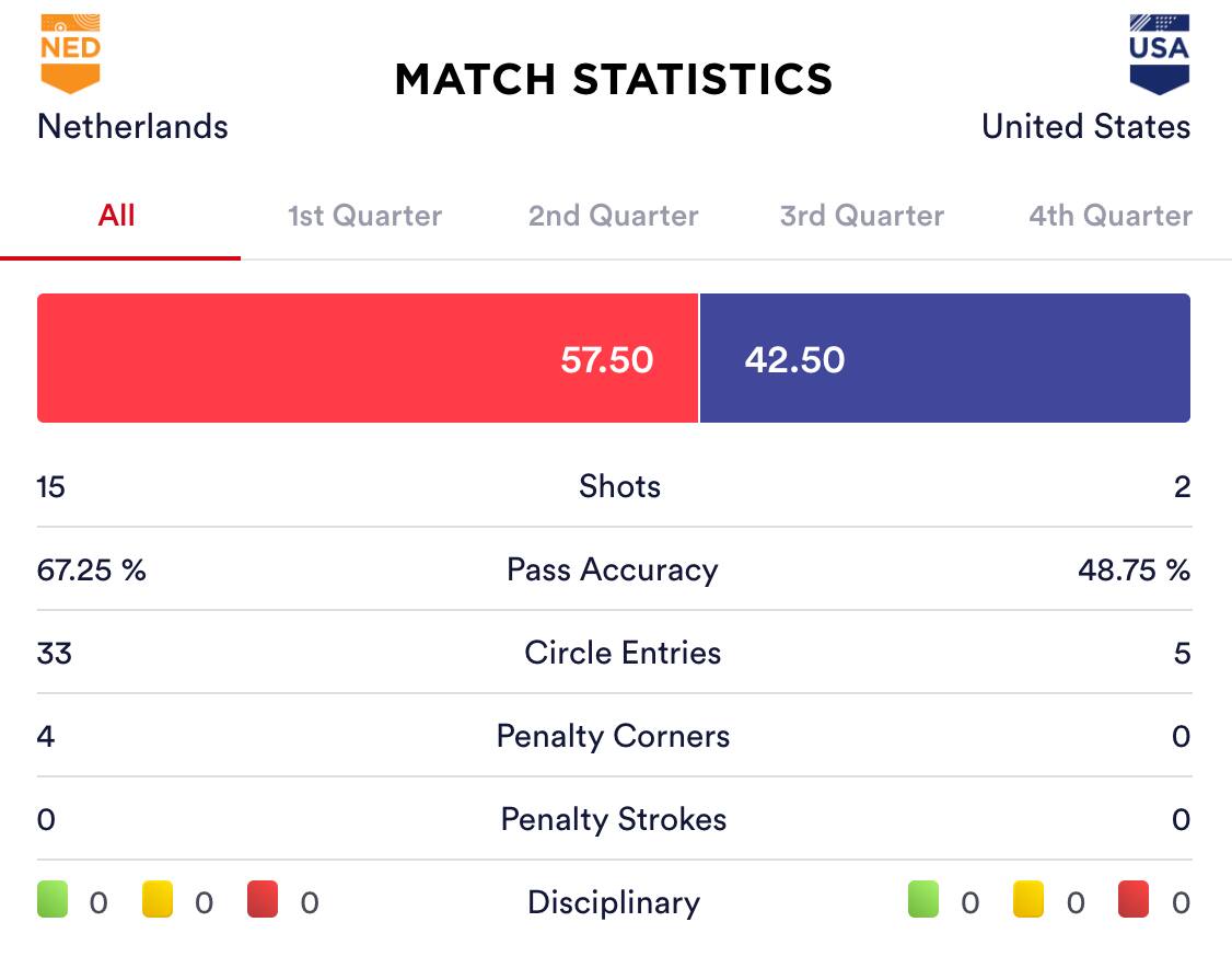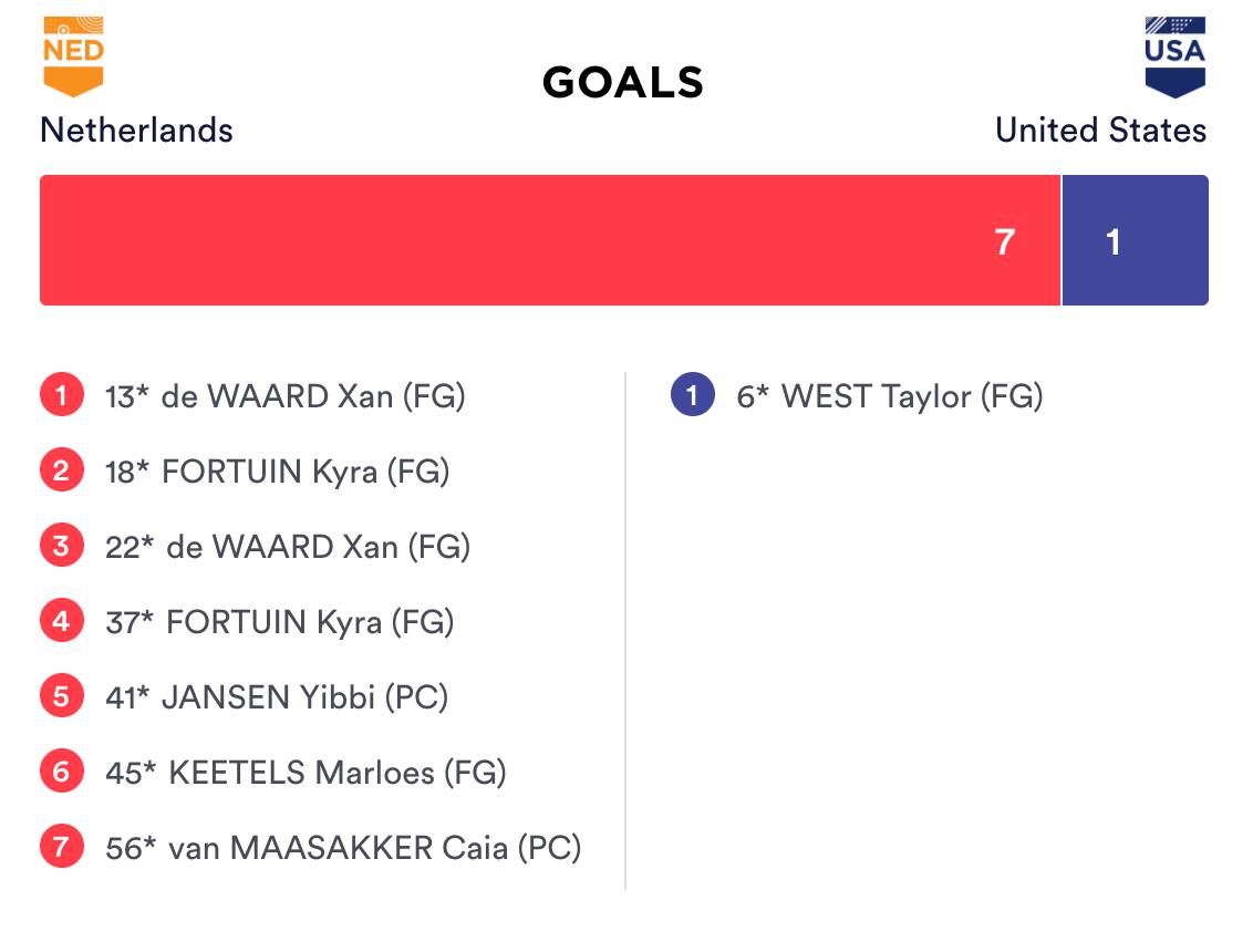 Both teams showed higher intensity to open the third quarter but played out in similar fashion. After a clear by Magadan was intercepted, the Oranje took advantage of an unsettled USA defense to get their second penalty corner of the match. Looking for her third goal, de Waard took the shot but Bing made the save and rebound save. In the 35th minute, Margot van Geffen scored for The Netherlands off a cross but USA asked for a video referral, arguing Alyssa Manley (Lititz, Pa.) was pushed prior to the goal. The referral confirmed this, awarding USA a free hit. Later the Oranje found the goal once more as Bing came out to challenge an undefended Fortuin. Now down 4-1, USA looked to counter attack but a misplayed ball by Linnea Gonzales (Bel Air, Md.) near midfield gave the opposition another scoring chance. Laurien Leurink took a backhand shot that was stopped by Bing before USA cleared. Moments later another penalty corner try would set up The Netherlands' fifth goal off a drag flick by Jansen in the 41st minute. With time winding down, after an initial shot by Ireen van dem Assem made Gonzales lose her stick, Marloes Keetels took advantage and scored as both teams hesitated waiting for a penalty corner to be called. The score stood 6-1 heading into the final quarter, where The Netherlands maintained control and did not allow USA a moment to clear or set up offensively. In the 56th minute on another penalty corner, Caia van Maasakker scored after the successful trap to give the team a 7-1 lead before the final buzzer sounded.