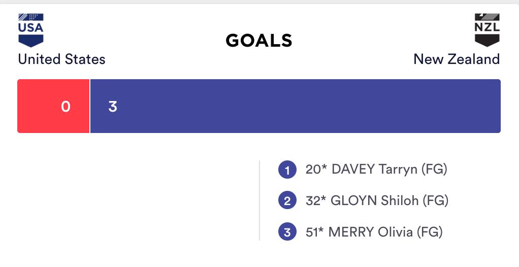 Shiloh Gloyn opened up the third quarter on a tip in goal to extend New Zealand’s lead. USA responded with another penalty corner attempt where Sharkey was stopped by O’Hanlon. USA would test the Black Sticks’ goalkeeper again seconds later with a try by Manley but could not connect on the cross by Grega. Back and forth play ensued that included two more penalty corners by USA whcih were again denied by O’Hanlon and her supporting defensive unit. New Zealand began the final 15 minutes with two fast entries and a penalty corner which saw Amy Robertson stretch along the post but her attempt hit the outside of the net. In the 51st minute however Olivia Merry tallied one more for New Zealand as she found herself one-on-one with Bing. The USA goalkeeper was forced to charge to block off the angle, colliding with Merry, but the FIH Pro League's leading goal scorer was still able to hit the ball in to the goal while falling down for the 3-0 advantage. USA kept up the grit in the final minutes but could not find any more chances as they ran in to a conservative opposition that waited out the clock.