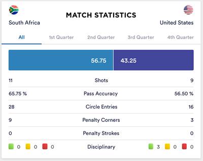 The second quarter was action-packed as both teams produced more scoring opportunities. Deegan Huisman (Almere, The Netherlands) registered USA’s first shot after quick touches found him with space but his shot was saved by South Africa’s goalkeeper Rassie Pieterse. Down the other way, South Africa produced another close chance as Nicholas Spooner deflected a backhand out of the air that hit the crossbar. This was followed shortly after by a succession of four penalty corners in a row for South Africa. The first three attempts were read well by flyer K. Kaeppeler as the fourth saw South Africa recover from a missed trap at the top and Spooner get a backhand shot off. The halftime score remained tied 0-0.