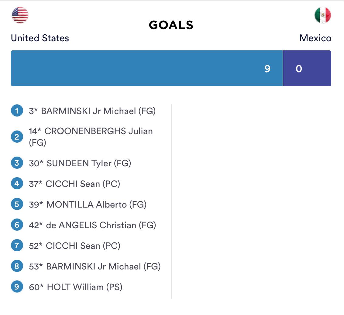 Still in a half-field press, Mexico was kept on their back foot as USA patiently weaved passes around the perimeter, but nearly got on the scoreboard on a fast-developing 3-on-3 play. Jorge Gomez passed over to Erik Hernandez for a quick strike but the play was broken up by P. Harris. Back the other way, a drag flick by Cicchi on a penalty corner found the bottom left corner of the goal in the 52nd minute, which was followed up one minute later by Barminski to make it 8-0. Still challenging Mexico’s defense Huisman had a pair of chances inside the circle before being taken down on a pass attempt to Sundeen. The ensuing penalty stroke was taken by Will Holt (Camarillo, Calif.) who buried it into the roof of the goal for USA’s ninth goal of the evening.