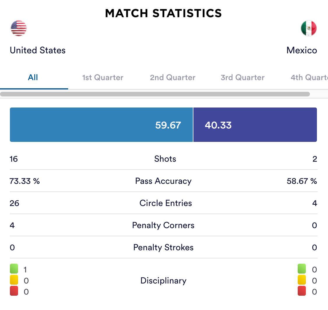 USA kept up momentum as the second quarter got underway with scoring chances by Patrick Harris (Moorpark, Calif.) and Paul Singh (Simi Valley, Calif.) before USA lined up for another penalty corner in the 20th minute. Back-to-back strikes by Aki Kaeppeler (Stuttgart, Germany) were saved by Hernandez but clears by Mexico were inconsistent as USA was able to chase down and intercept. With time running low in the half USA set up a flurry of shots in the final moments, including shots by Deegan Huisman (Almere, The Netherlands) and P. Harris. The attempts would pay off when Huisman chased down the ball and passed to Tyler Sundeen (Simi Valley, Calif.) in the goalmouth, beating the halftime buzzer and goalkeeper Hernandez to give the red, white and blue a 3-0 lead.