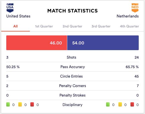 The Netherlands continued to show scoring dominance in the fourth quarter, adding another five to the scoreboard. The fifth goal came off a textbook penalty corner conversion where a drag by Matla was sent down to Welten who deflected it into the net. Next, again off a penalty corner, a slip behind sweep was saved by Robles but the rebound fell to The Netherlands and was crossed and batted out of the air by Albers. Welten grabbed her third of the game on the seventh goal and Ginella Zerbo added her name to the scoresheet on the eighth. The Oranje rounded out the scoring in the 59th minute on a one-time hit from Maria Verschoor. The final score was in favor of the Oranje, 9-0.