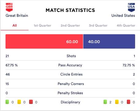 Coming out of the break, USA produced their best defensive effort by limiting Great Britain on the number of circle entries while allowing zero goals. Although they were under a lot of offensive pressure, USA now behind the leadership of goalkeeper Kealsie Robles (Yorktown, Va.), maintained composure to deny the seven attempts on goal.