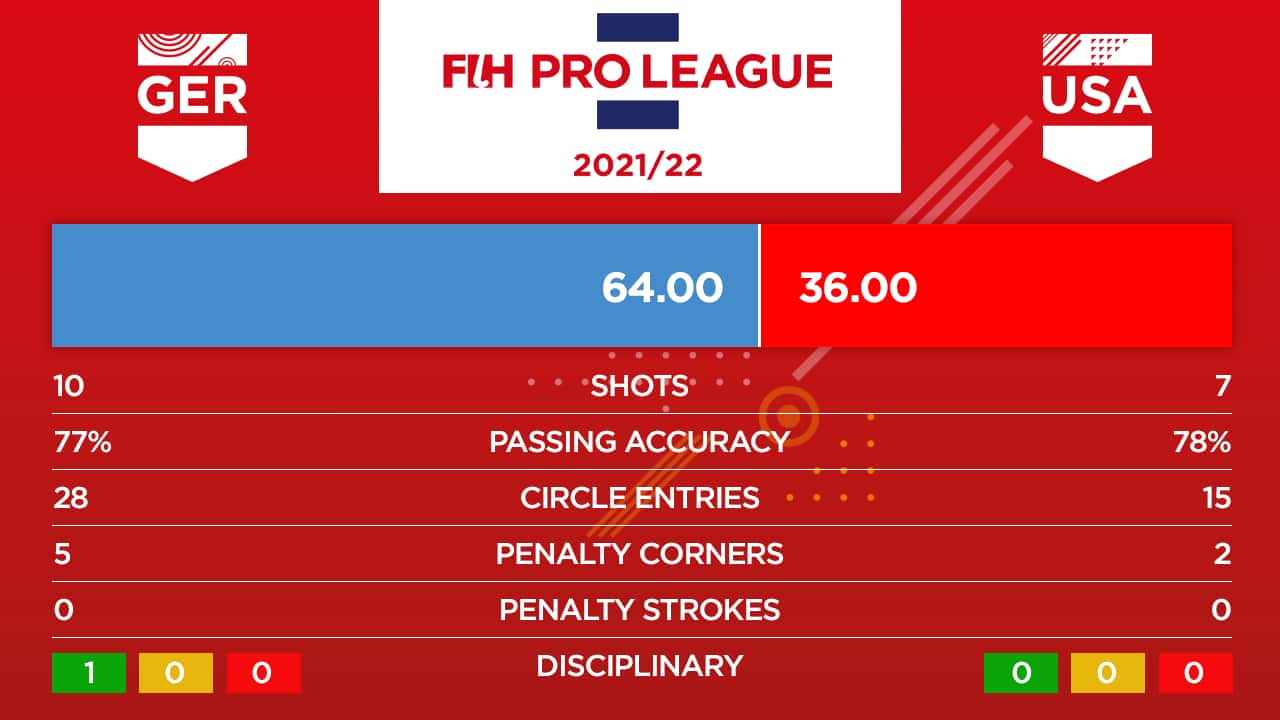 USA upped their pressure at the start of the fourth quarter, looking to generate deep turnovers on Germany. The persistence paid off as the red, white and blue earned their second penalty corner in the 56th minute. The high drag by Hoffman was saved by Sonntag and the rebound shot by Rodgers was deflected wide as USA was unable to convert. USA continued to push forward and a backhand delivery into the circle went untouched in the final minute, as Germany held on for the 2-0 win.