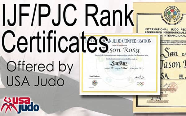 Handsome Official Rank Certificates, issued by the International Judo Federation and USA Judo can be purchased with the name of the Black Belt recipient and other details hand printed by a calligrapher on the document.