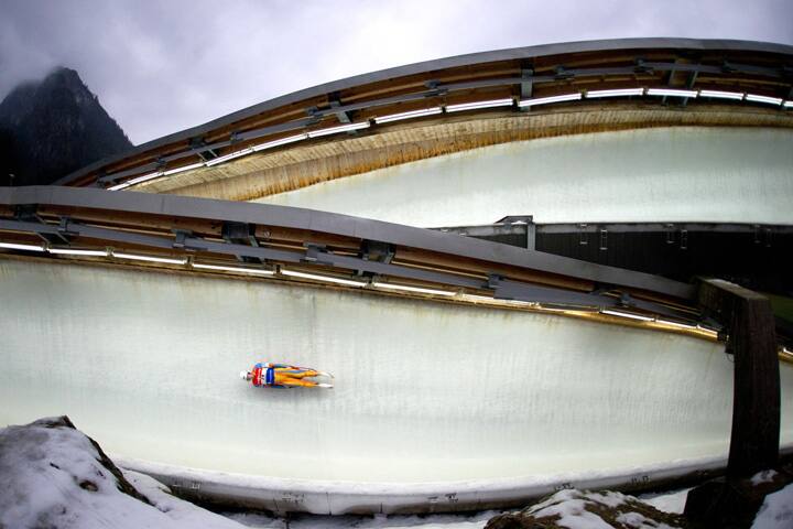 "This track is nestled in the Bavarian Alps of Germany, in the shadows of Hitler's Eagles Nest. This track's character sets it apart from all other courses in that it's visually charming with its copper and cedar shake curve tops. While sliding, unique curve combinations and tight curve radiuses never leave the athlete without something to do. Straight-aways that bend, four s-curves that go by in a flash, a kreisel curve that's easy to get lost in, and finally pulling to five G-forces in the the finish curve has left more than one slider dragging their head on the ice. Add all this together, and you have one exciting track for the racer and the spectator alike."