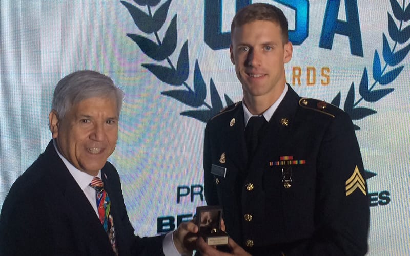Greg Rosenbaum gives Sgt Nathan Schrimsher his Olympic ring