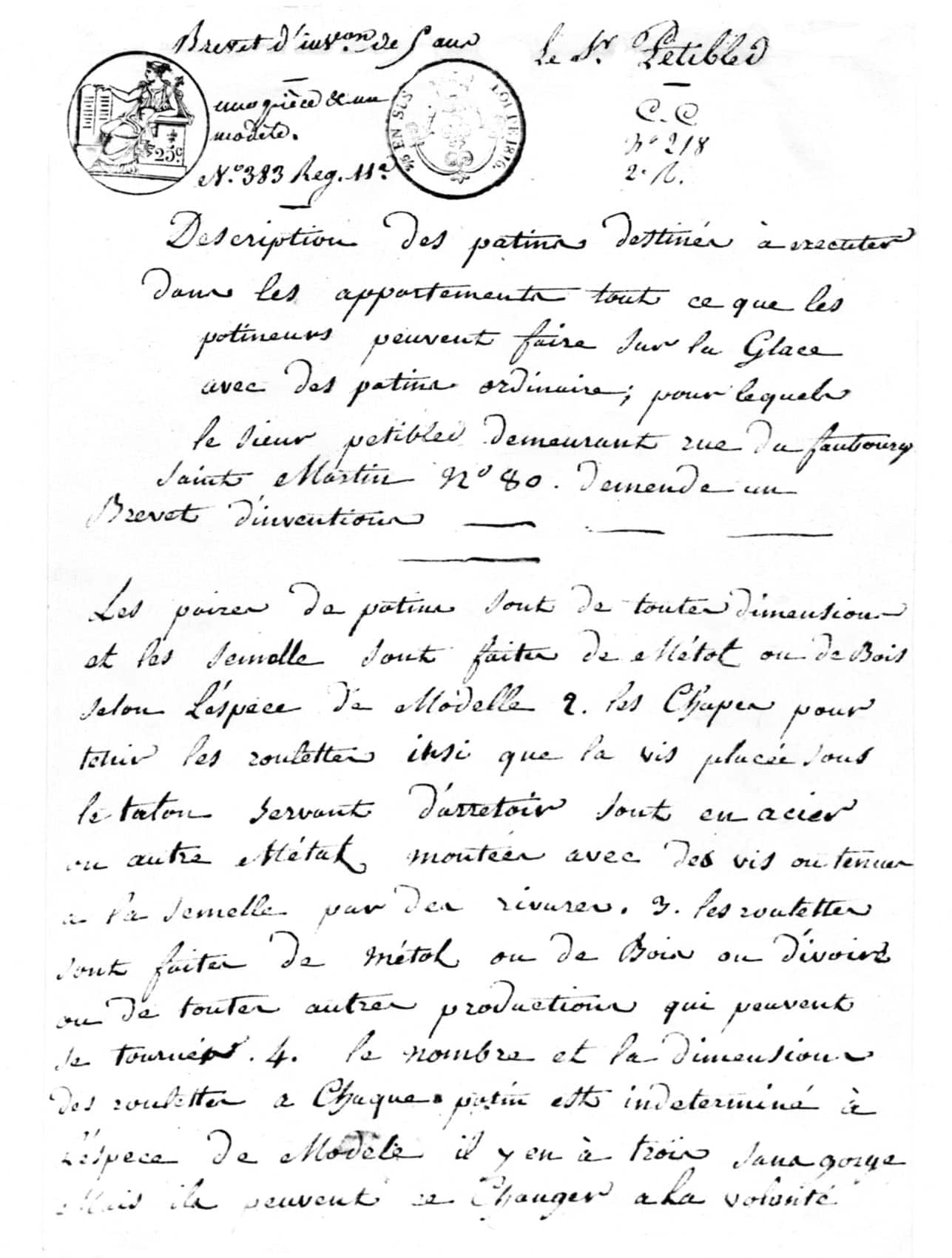 A model of the skate was filed with the "Patent Office". The objects deposited in this office were then forwarded to the Conservatoire des arts et métiers... but Petibled's skate was not kept.