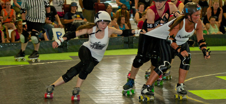 Roller derby is a contact sport played by two teams on roller skates, on an elliptical track, in contest called “jams” that can last up to 90 seconds each. Each team will have up to five total players on the track, including four Blockers (one blocker is called the Pivot and has a stripe on his/her helmet) and one Jammer (who will have a star on his/her helmet). Each team will have one scoring player (which may be either the Jammer or, under some circumstance, the Pivot) who will earn points by passing opposing players on the Track. Blockers skate together in a group, called the Pack. Each team’s Blockers will attempt to assist their own scorer in navigating the pack, while simultaneously trying to prevent the opposing scorer from making his/her way through the pack. They are largely response for the constant contact as they engage in checks and bumps. The team with the most points at the conclusion of the game will be the winner.