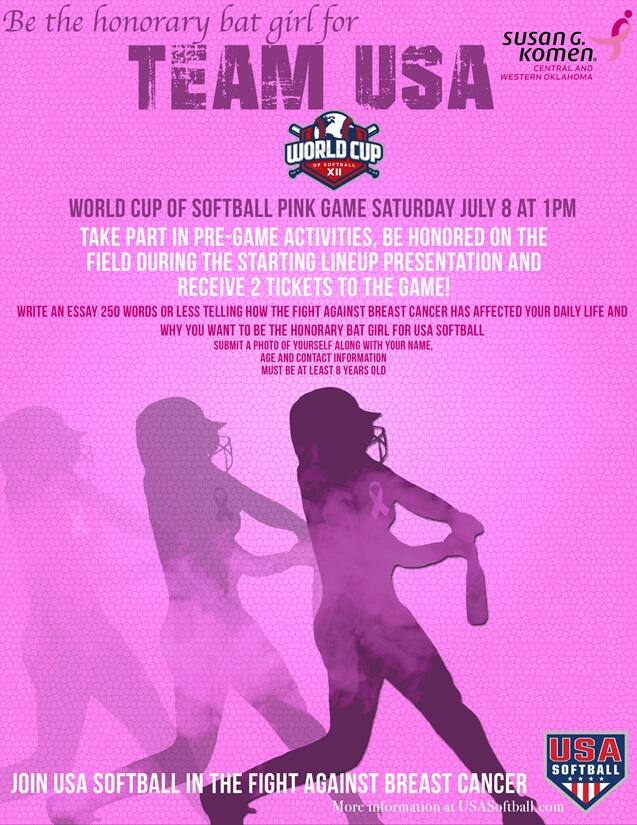 Join USA Softball in the fight against breast cancer! Be Team USA's honorary bat girl during the World Cup of Softball Pink Game Saturday, July 8 at 1 p.m. CT. Take part in pre-game activities, be honored on the field during the starting lineup presentation and receive two tickets to the game.