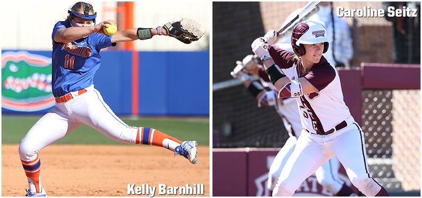OKLAHOMA CITY — Strong outings in the circle and at the plate have landed Florida’s Kelly Barnhill (Marietta, Ga.) and Mississippi State’s Caroline Seitz (Birmingham, Ala.) USA Softball Collegiate National Co-Player of the Week honors for Week 10 of play USA Softball announced today. This marks the first Player of the Week accolade for each athlete, who helped lead their respective teams to Southeastern Conference (SEC) series wins on the road.